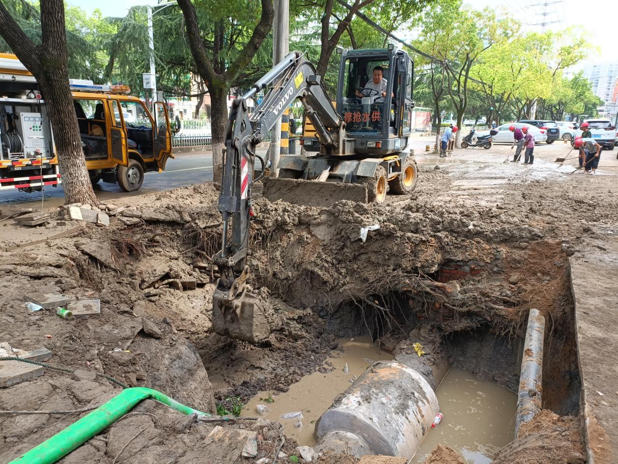 在搶修現(xiàn)場看到,公司副經(jīng)理曾國剛、運(yùn)維部部長劉要華正在組織工作人員設(shè)置路障,指揮挖掘機(jī)開挖路面、清理淤泥。2輛搶修車停在路邊,保障后勤需要,10余名工作人員正在分工明確地投入到緊張的搶修中。