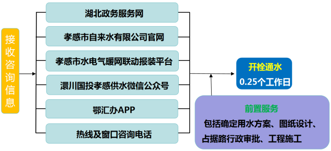 流程說明:供水企業(yè)通過孝感市“多規(guī)合一”業(yè)務(wù)協(xié)同平臺及工程建設(shè)項目審批管理系統(tǒng)推送獲取項目建設(shè)信息后主動對接,先行開展確定用水方案、圖紙設(shè)計、工程施工等服務(wù),辦理用水工程涉及的占道、掘路、占用綠地、伐移樹木等相關(guān)行政審批手續(xù),提前完成外線工程實施,為客戶提供“無感免申請”服務(wù)。客戶需要用水時,0.25個工作日內(nèi)開栓通水。