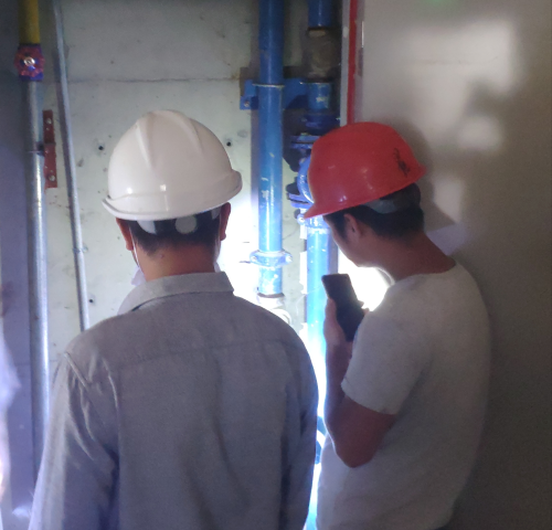 驗收小組依次巡查了用水閘閥,入戶水表,供水管道,供水井蓋,二供泵房、樓頂水箱等供水設(shè)施,施工方全程參與。本次驗收中發(fā)現(xiàn)4處管道井安裝不合格,部分管道油漆標識不清晰,入戶水表前后管徑不一致、二供泵房未做防鼠設(shè)施等問題,當即要求施工方整改。